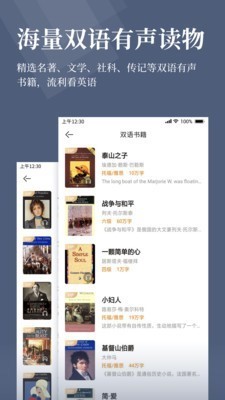 3、海量双语有声读物:精选名著、文学、社科、传记、短篇等模块;更有丰富的有声英语小说,让你的英语听力同步提高。