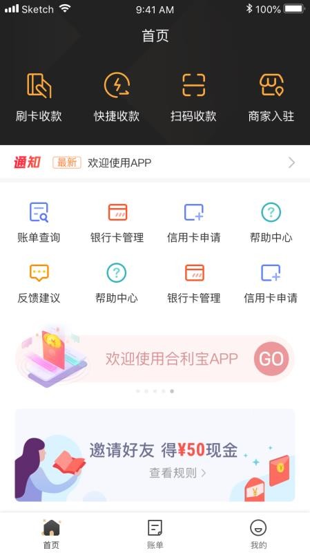 1.在应用首页顶部客户可以查看所有的收款功能,刷卡、快捷、扫码,快速收款;