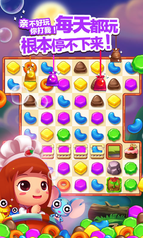 1. 消除玩法:玩家通过滑动屏幕来交换相邻的糖果,使三个或更多相同颜色的糖果连成一线进行消除。