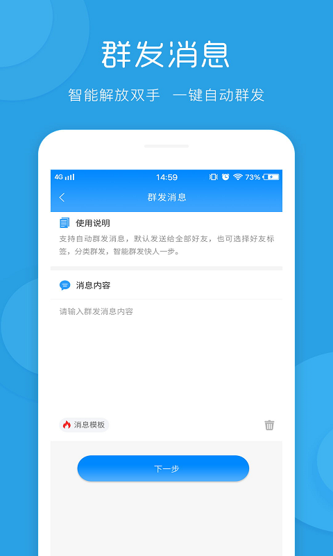 一键群发app通过智能化、自动化的操作方式,帮助用户实现消息、图片、表情、视频等内容的快速群发。其独特的亲密群发功能能够在群发信息时自动添加好友的昵称,让信息更加个性化、有温度。此外,app还提供了丰富的祝福语模板和货源信息,以及检测僵尸粉、管理客户等实用功能。