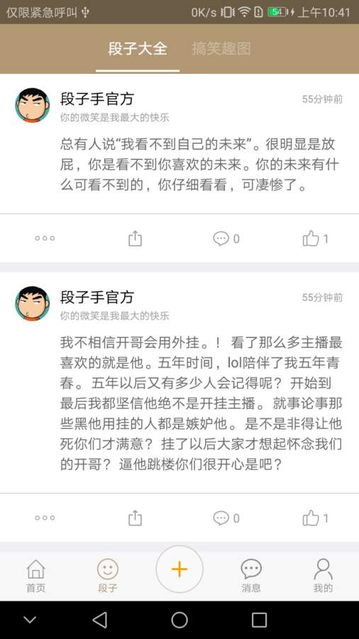 段子乐app是一款类似内涵段子搞笑幽默的社交平台,适合年轻人们在这里搞怪聊天,或者发表一些有趣的轶事和新闻,给你各种上等笑料哦。这款软件内有非常多的搞笑段子,让你能够在休闲时光娱乐一下,让你的心情更好,用户可以在这里学习到段子,欢迎各位感兴趣的朋友们下载使用。