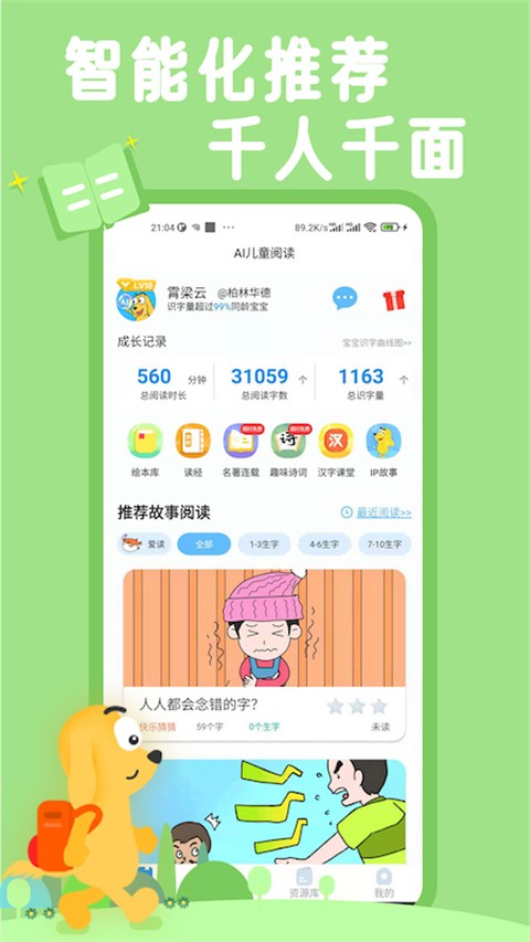 2. 智能推荐绘本:根据用户识字量智能推送0-10个生字的原创故事绘本,确保阅读内容的适宜性和挑战性。