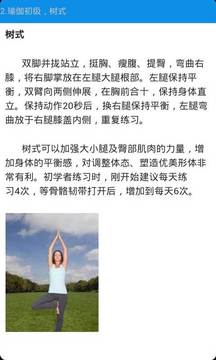 2. 瑜伽体式:提供数十种瑜伽体式的教学视频和图片,包括基础体式、进阶体式等,满足不同用户的练习需求。