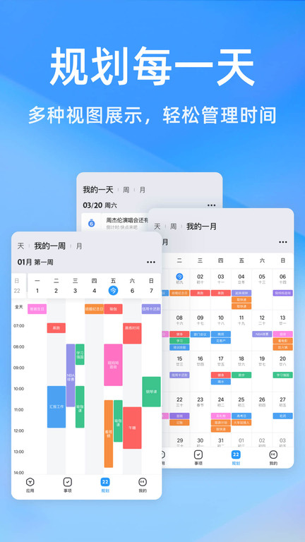 3. 多视图模式:提供我的一天、一周、一月、一年等多种日程视图查看模式,用户可以根据自己的需求选择合适的视图进行查看和管理。