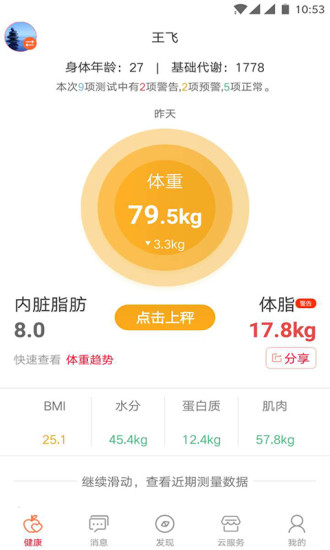 3. 健康数据分析:实时跟踪并分析用户的体重、体脂率、肌肉量等健康数据,提供可视化报告。