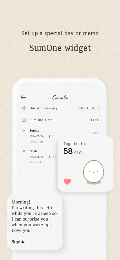 SumOne由monymony corp.开发,支持安卓和iOS系统。软件以简洁、易用的界面设计为主,提供了文字、图片、语音等多种记录方式,方便情侣们随时随地记录生活中的点滴,分享彼此的心情与回忆。