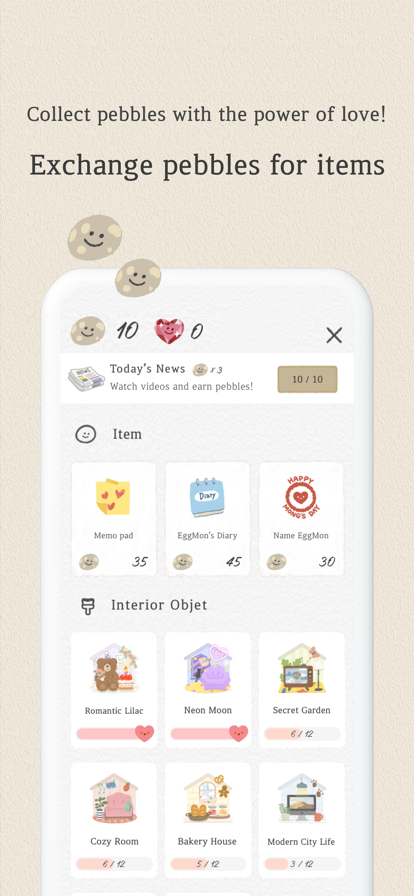 4. 个性化装饰:软件提供了丰富的道具、家饰品等装饰元素,用户可以使用在应用中收集的鹅卵石(应用程序内货币)购买各种物品来装饰小蛋蛋的房间。