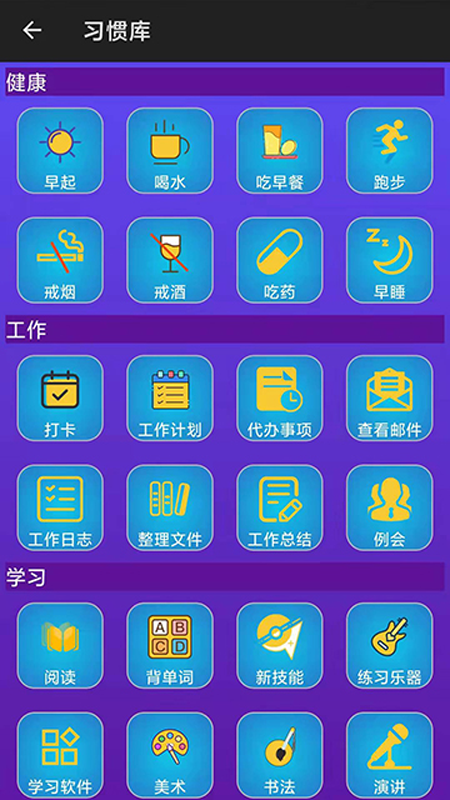 1. 设定习惯计划:用户可以根据自己的目标和需求,自定义习惯养成计划,包括习惯名称、目标周期、提醒时间等。
