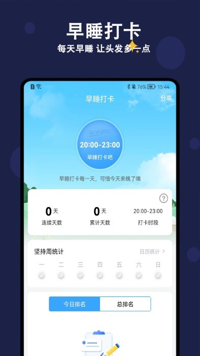 天天早睡打卡软件基于科学的睡眠管理理论,结合用户个人习惯,提供个性化的早睡计划。用户可以在软件中设定自己的早睡目标时间,每天完成打卡任务后,软件会记录并展示用户的睡眠改善进度,同时提供睡眠建议和改善方案。