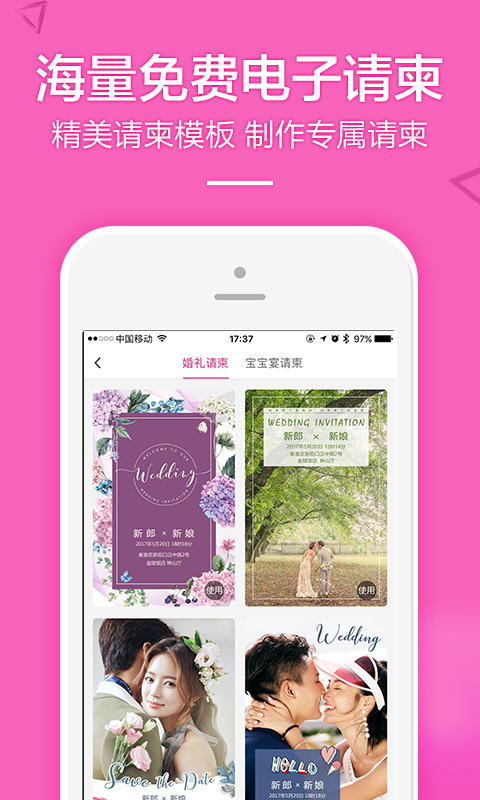 4、方便:7大筹婚工具涵盖备婚全程,轻松好玩让你不再为琐事烦恼!嫁娶黄道吉日一键筛选,更快锁定好日子!超精美电子请柬为你向亲朋传递幸福,筹婚攻略助你轻松过关斩将,婚礼管家24h为你服务,更多玩法,等你来发掘!