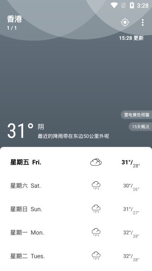 1. 实时天气:显示当前天气状况,包括温度、湿度、风速等基本信息。