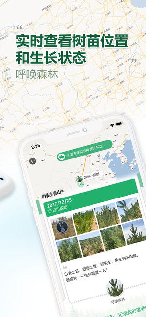 呼唤森林app连接用户、企业和林业机构,以“树木”为核心,通过树木认领、树木赠送、树木分享、树木环保信息等功能,帮助用户在地球的某一角落种植一棵属于自己的树。用户可以查看树木的真实照片、地理位置,以及固碳量、固土、排氧量等数据,用植树的方式来记录每一个重要的时刻。