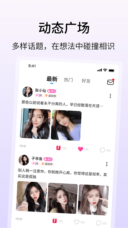 4. 动态广场:用户发布的个人动态集合,支持点赞、评论和分享。