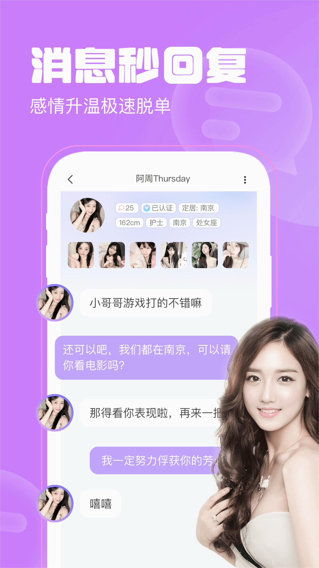 3. 同城聊天:APP提供了一键搭讪功能,用户可以快速开启聊天,实现秒速回复,有助于用户更快地结识到兴趣相投的人。