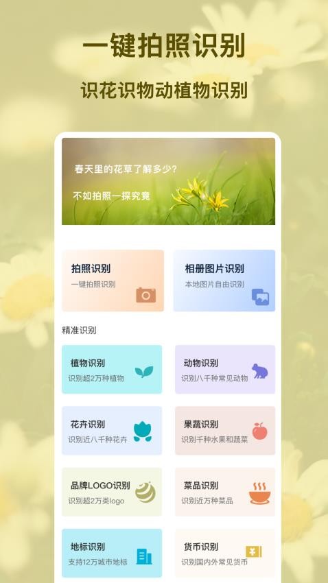 行色识物app通过拍照或上传图片的方式,利用先进的图像识别技术,实现对多种物体的快速识别。软件支持识别超过10万类物体和场景,包括但不限于2万种常见植物、近8千种花卉、近千种果蔬、近万种菜品以及国内外常见货币和约12万处地标景点。识别结果准确度高,且附带丰富的百科信息,满足用户的学习和探索需求。
