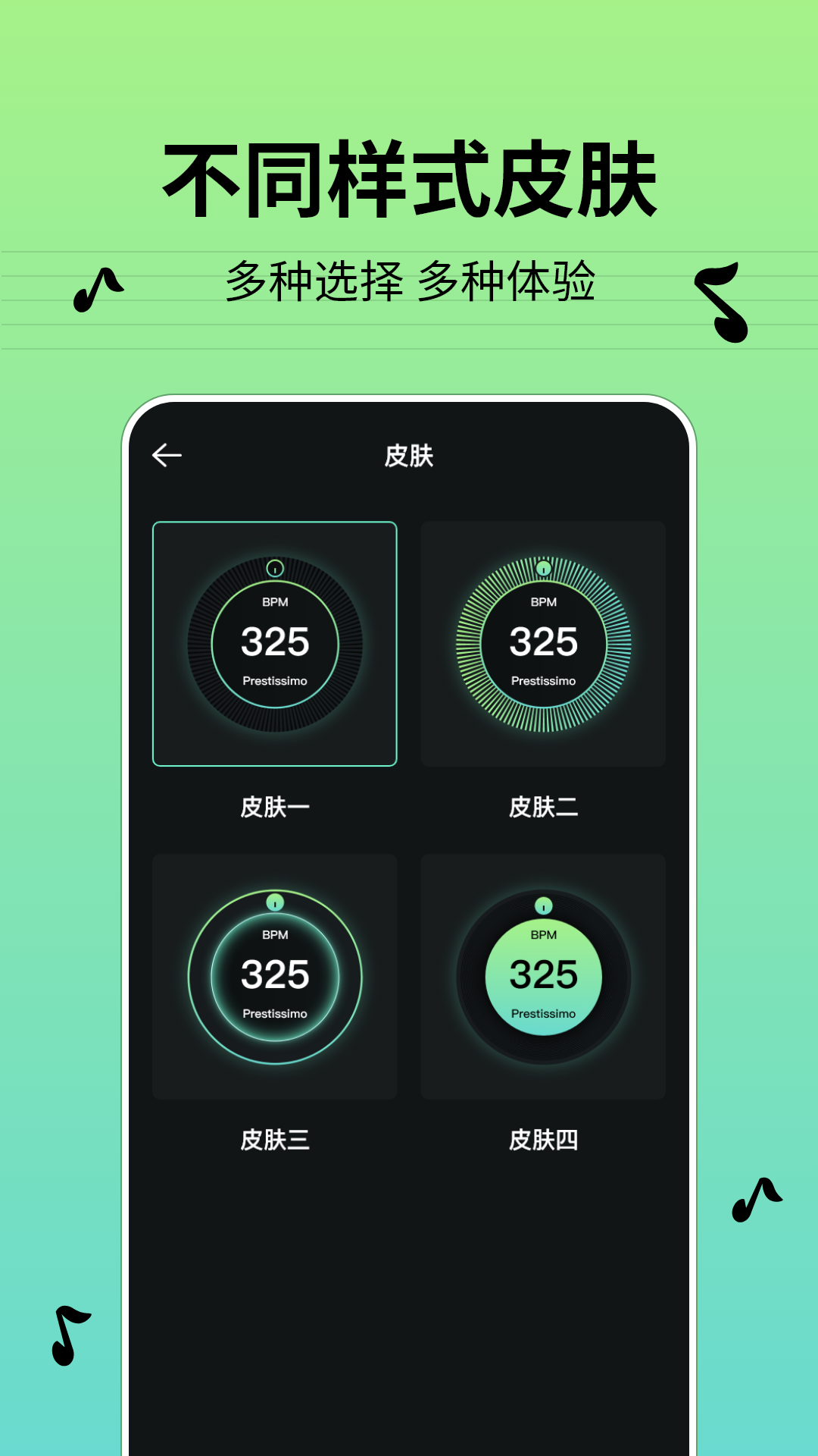5. 个性化皮肤:支持多种款式皮肤,用户可以根据喜好随时更换,打造专属于自己的节拍训练界面。
