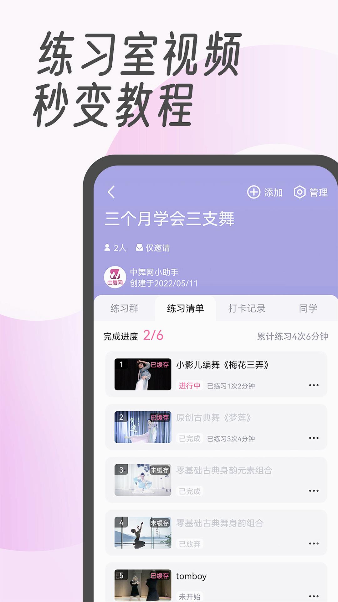 1. 定制练习清单:从零基础到专业舞者,人人皆可定制个性化的练习清单,借助练舞工具坚持每日打卡,让学舞、练舞变得更加简单有趣。