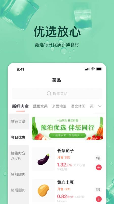 预泊优选app是一款集购物、优惠、便捷服务于一体的手机应用平台。该平台致力于为客户提供安全、放心可靠的产品及高品质服务,严格甄选每一样产品,并进行高品质质量管理,确保将上乘的新鲜产品源源不断地运往客户单位,为客户的食品安全保驾护航。