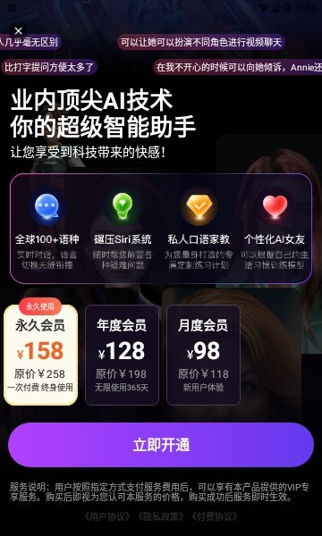 1. 智能对话:提供实时语音和文字对话功能,Annie能够听懂并回应各种问题,帮助用户解决问题、学习英语或进行闲聊。