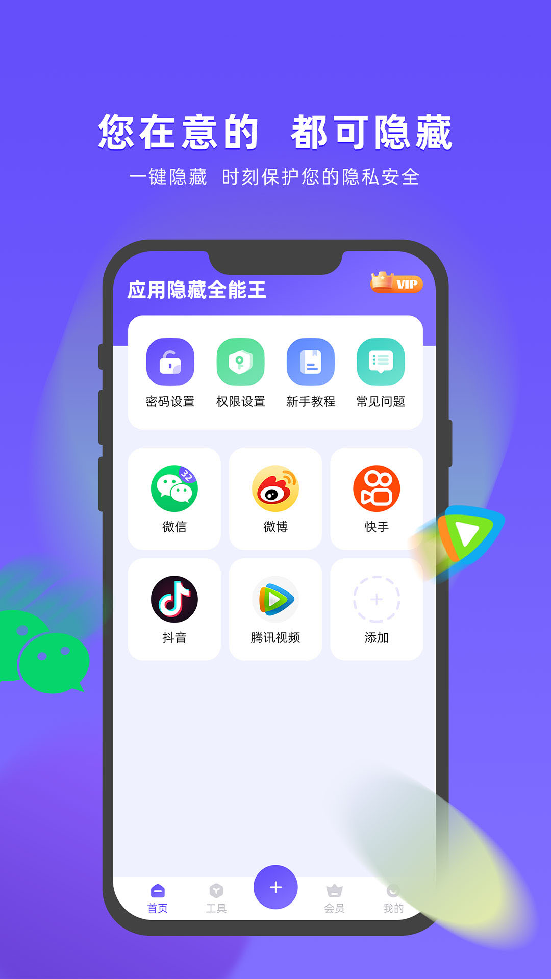1. 应用隐藏:支持隐藏手机中的任意应用,包括社交、游戏、支付等敏感应用。