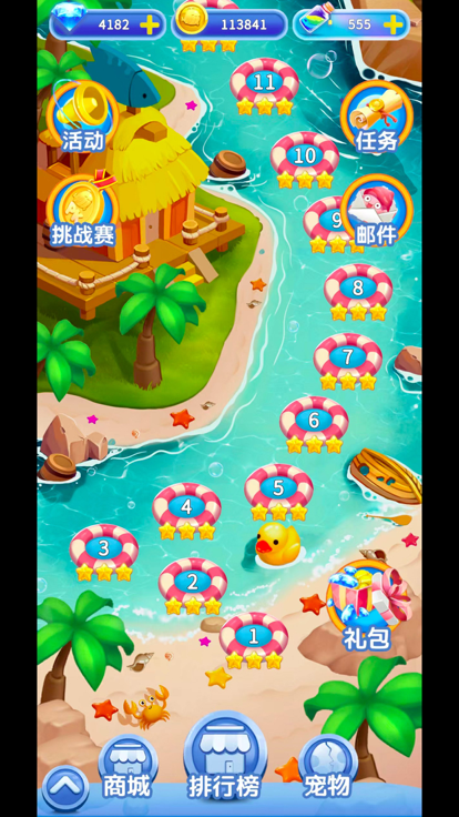 3. 消除元素:在关卡中,通过滑动屏幕,连接三个或更多相同的海洋元素进行消除。消除越多,得分越高,还能触发特殊道具和技能。