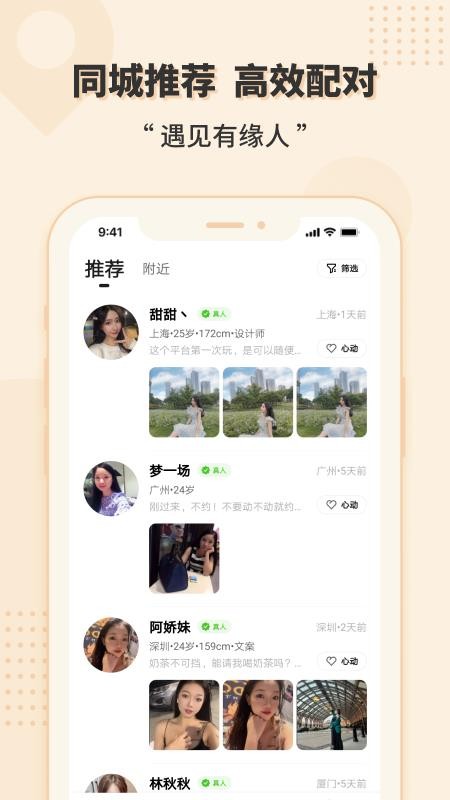 1. 同城匹配:根据用户的资料条件,精准匹配到同城和自己兴趣爱好相近的人,方便用户进行线下交流和互动。