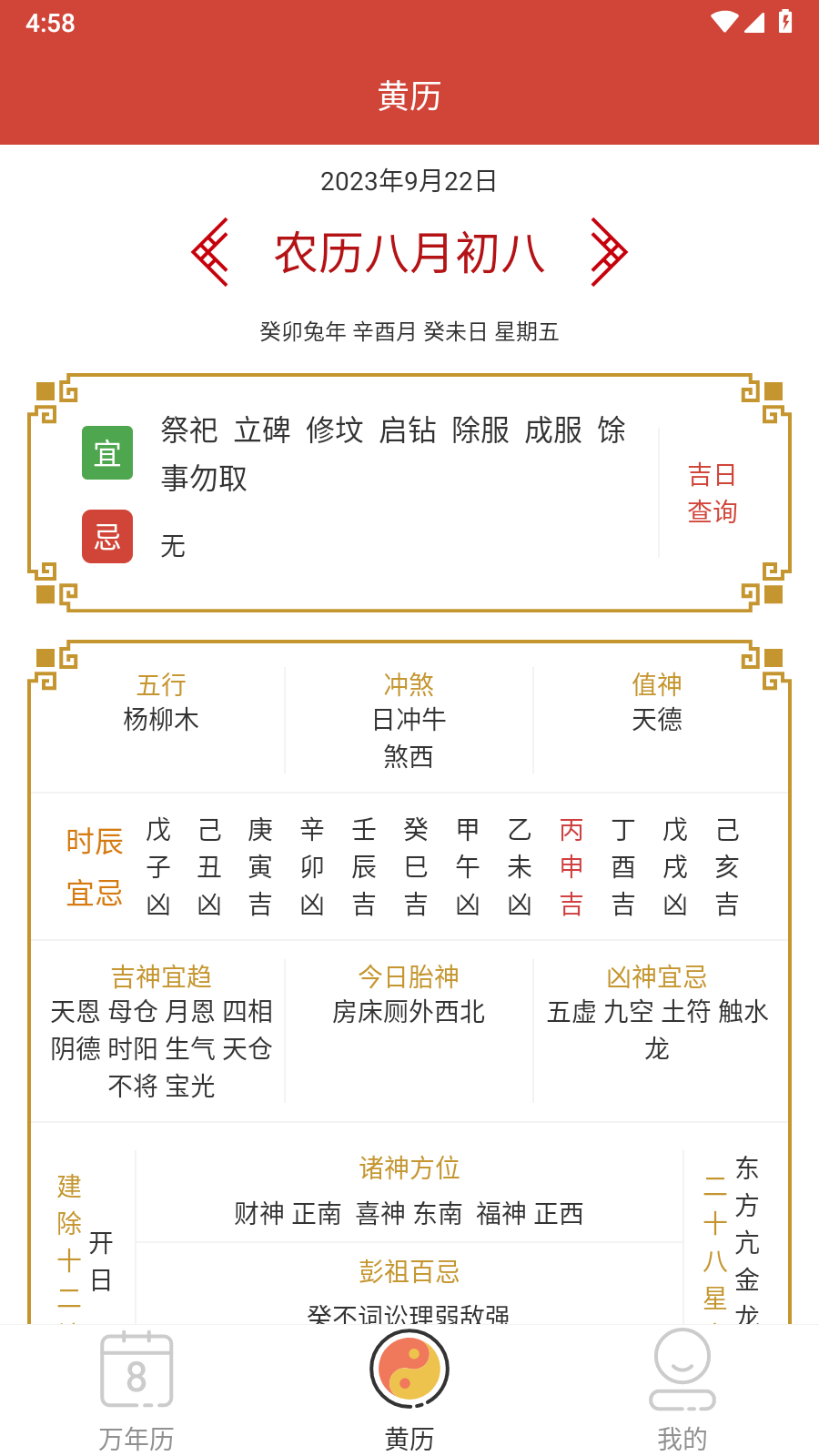 3. 黄历宜忌:提供每日黄历宜忌信息,帮助用户了解当天的吉凶祸福,指导用户的日常活动。