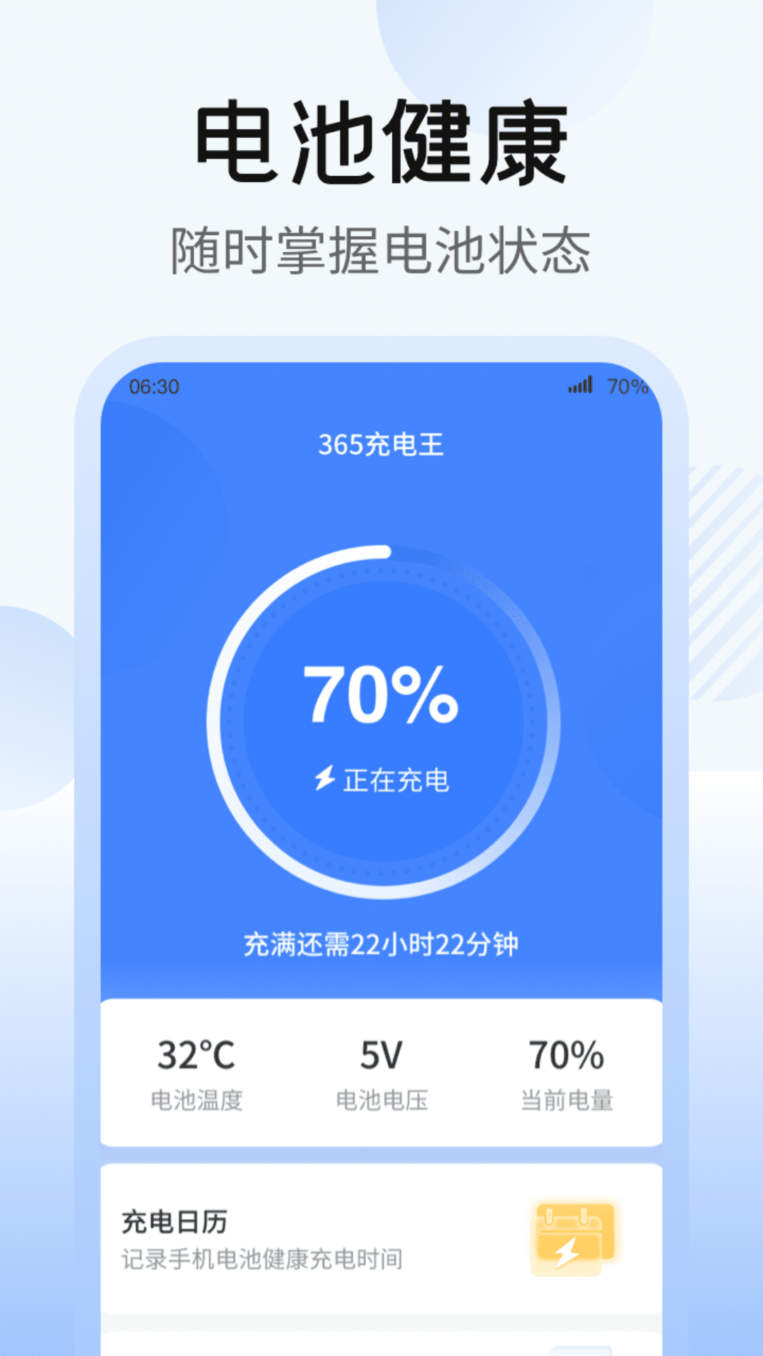 365充电王是一款专为智能手机及平板电脑设计的电池管理与优化应用,旨在帮助用户延长设备使用时间,优化充电效率,并提供全面的电池健康监测服务。