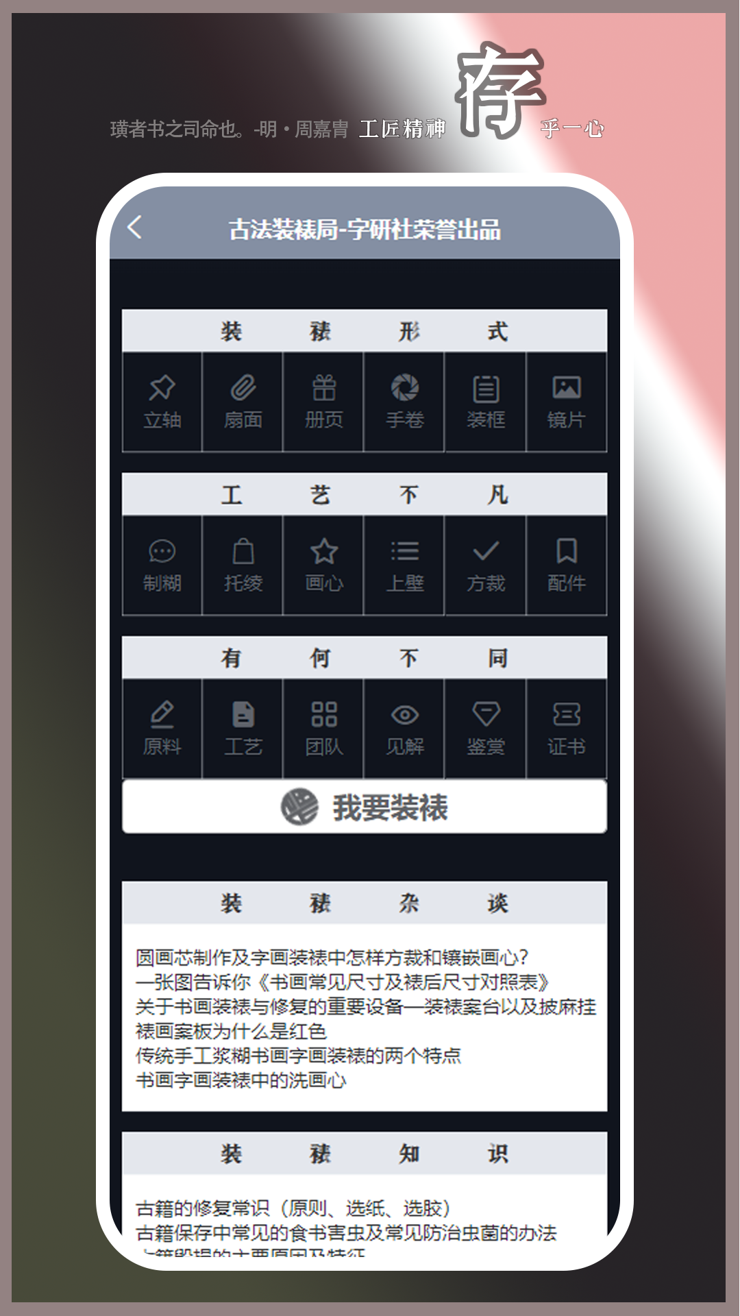 1. 学习装裱知识:通过app内的详细教学,了解装裱的历史、工艺和技巧,提升自己的专业水平。