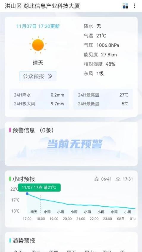 武汉天气APP集成了最新的气象数据和技术,通过直观的界面展示武汉地区的天气状况,包括温度、湿度、风力、空气质量等详细信息。同时,还提供未来七天的天气预报,以及生活指数如紫外线强度、穿衣指数、洗车指数等,满足用户多样化的需求。