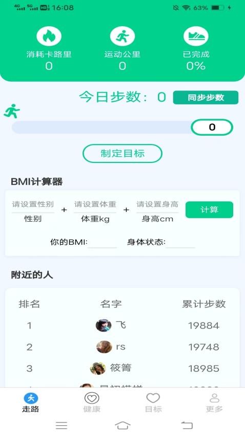 1. 主界面:展示当天的步行步数、行走距离和消耗的卡路里等关键信息。