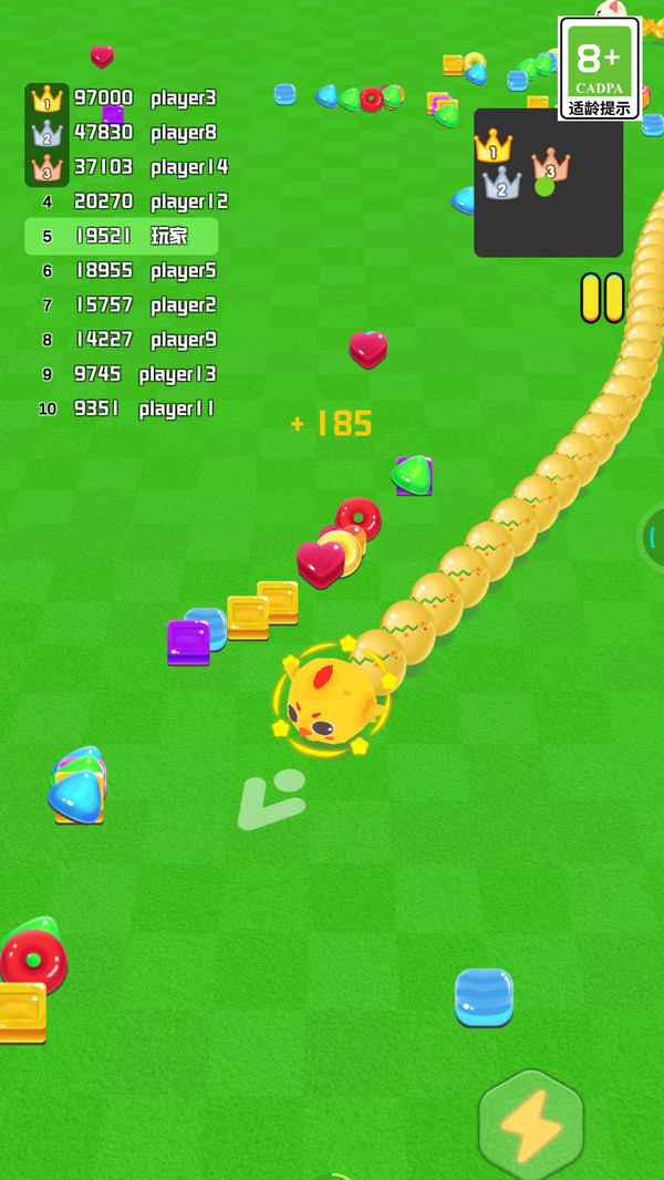 通过吞噬特殊食物(如钻石糖果)获得进化点数,提升速度、防御力或解锁分裂技能。达到特定长度可激活“三头蛇”形态,分身独立行动但降低防御,需权衡攻防节奏。