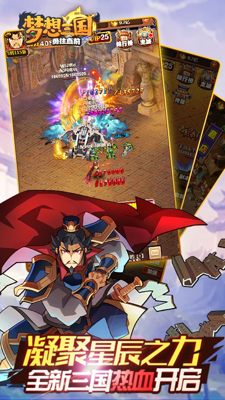 游戏以东汉末年群雄割据为背景,玩家化身主公招募名将,通过副本闯关、帮派争霸、跨服竞技等玩法,逐步征服九州。核心机制包括武将收集与培养、装备强化、技能搭配、羽翼系统等,结合未来科技元素(如机甲变身、五行克制),形成差异化三国题材体验。