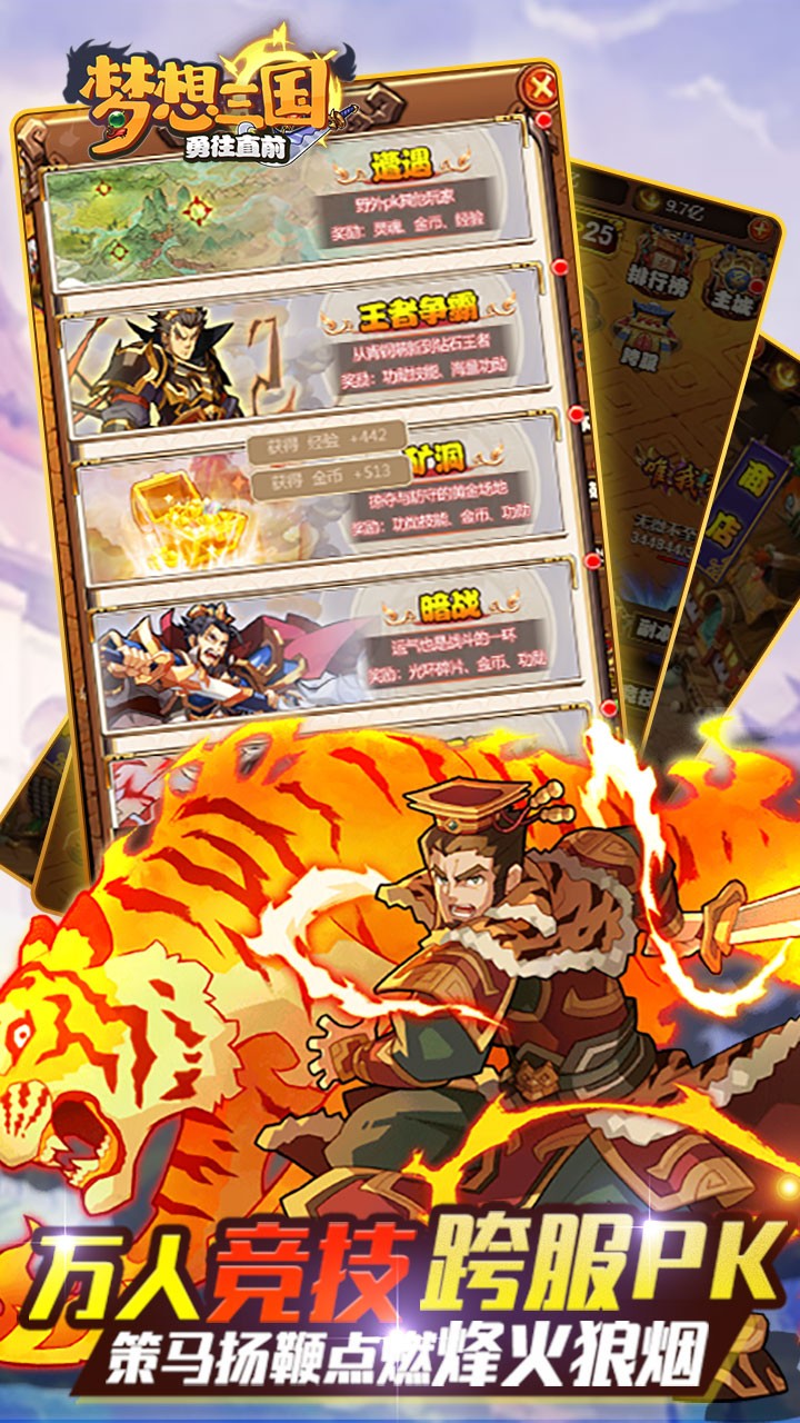 - 巅峰对决:实时匹配玩家进行3V3团队战,积分排名奖励稀有武将卡;