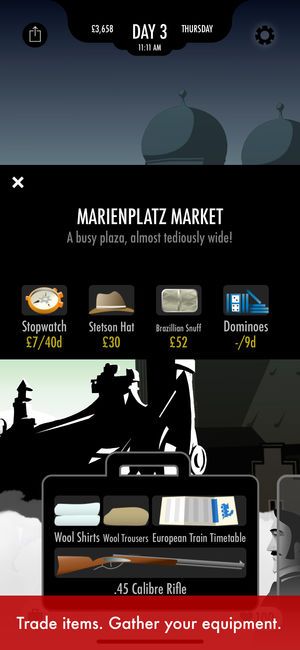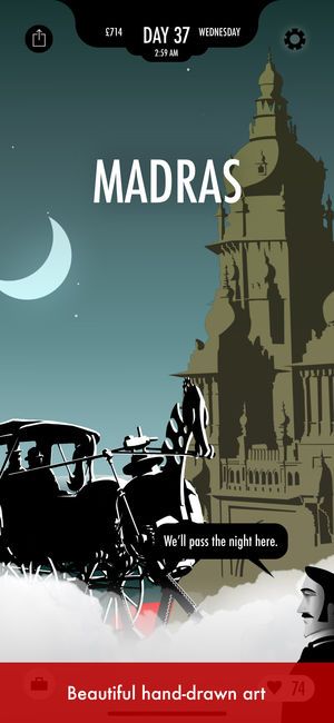 《80 Days》以交互式小说的形式展开,玩家需通过选择对话、规划路线、管理资源(时间、金钱、健康)来推动故事发展。游戏世界由数百个可探索的城市组成,每个地点均拥有独特的文化、事件和人物互动。玩家需根据实时变化的交通方式(火车、轮船、热气球等)、天气条件和突发事件调整行程,同时应对雇主福格的冷峻指令与突发危机,最终在80天内返回伦敦。
