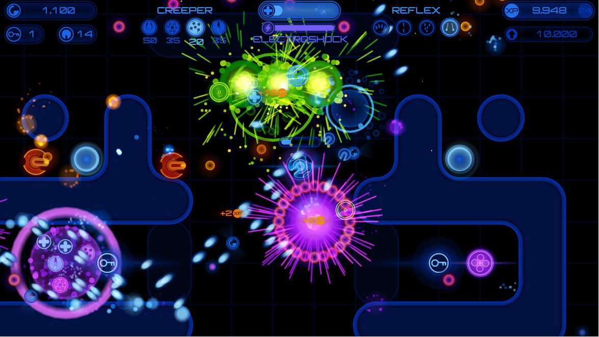 几何霓虹风格与粒子特效形成强烈视觉冲击,BOSS战的光影效果堪称移动端顶级。背景音乐采用电子合成音,与弹幕节奏完美同步,增强沉浸感。
