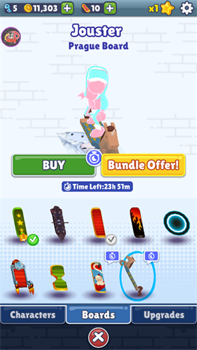 玩家可操控“梦幻杰克”或解锁其他角色(如黑色崔琦、黑白机器人),搭配专属皮肤(如粉蓝色全身皮肤)与滑板(带动漫女孩头像)。3.0版本新增隐藏角色与皮肤,需通过挑战解锁。