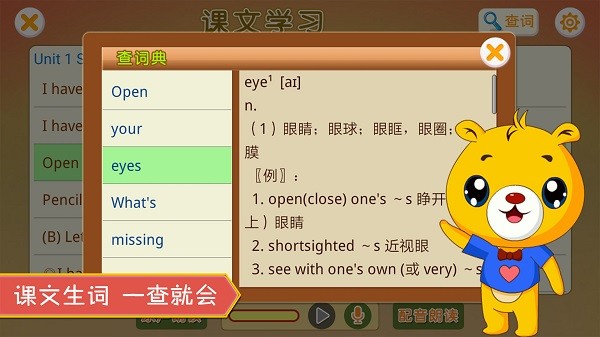 1. 单词学习:软件包含了教材中的所有单词,每个单词都有详细的释义、发音、例句和图片。学生可以通过多种方式学习单词,如单词跟读、单词拼写、单词游戏等,全面掌握单词的读音、拼写和用法。