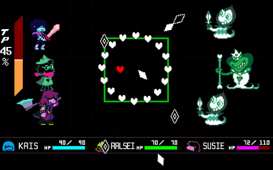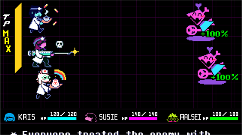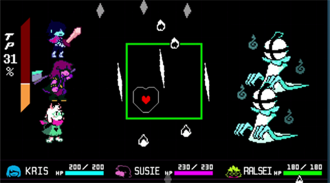 - 角色可通过战斗提升攻击速度、防御、魔法穿透等属性,并解锁专属技能。伙伴苏西(Susie)擅长近战,拉尔赛(Ralsei)提供治疗支援。