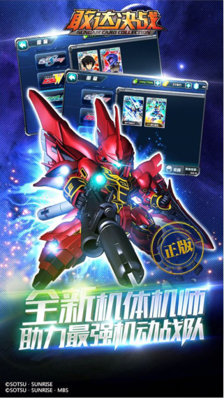 《敢达决战》是由日本万代南梦宫娱乐与DeNA中国联合开发、中国大陆地区首款获得《机动战士敢达》正版授权的动作卡牌类手游。游戏自2016年上线以来,持续更新内容,现已推出2.0版本,涵盖宇宙远征、竞技排名、极限竞技场等多元模式,并深度还原《机动战士敢达》《敢达SEED》等经典作品剧情。玩家可收集上百台原著机体及阿姆罗、基拉等知名机师,组建专属战队,体验策略布阵与即时战斗的双重乐趣。