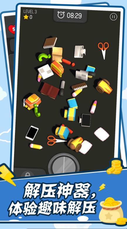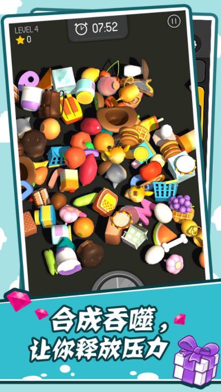 休闲模式中,玩家可无压力吞噬琳琅满目的3D物品(如金猪宝箱、彩色方块),配合消除特效与治愈画风,释放生活压力。竞技模式则强调紧张感,史莱姆小球在吞噬中逐渐膨胀为庞然大物,碾压对手的瞬间带来强烈爽感。