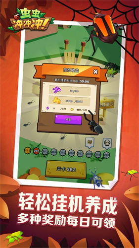 - 资源管理:收集金币、DNA等资源升级虫虫技能,或通过挂机收益功能离线积累资源。