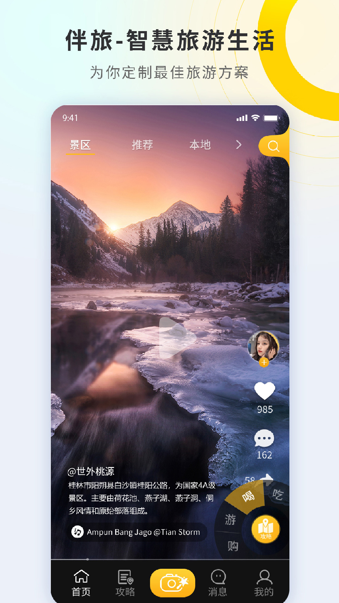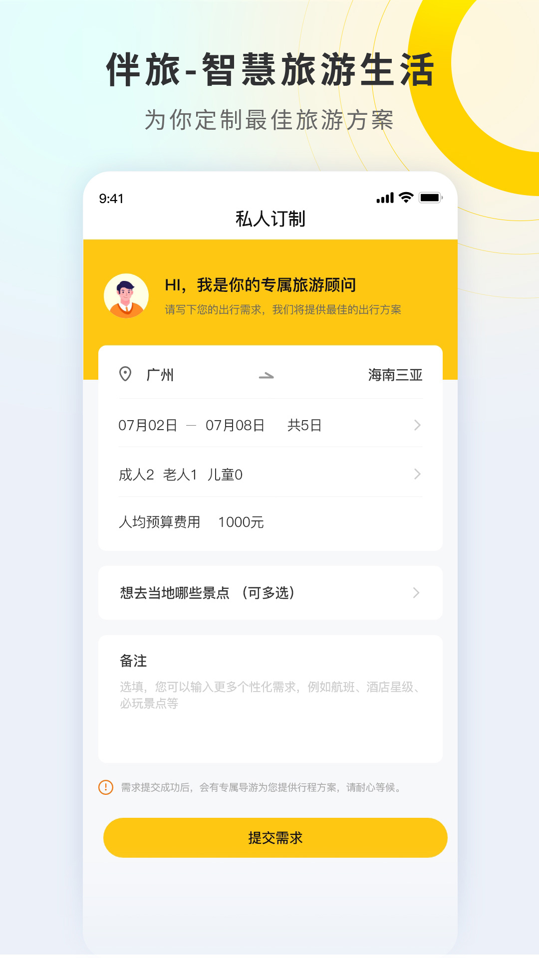 伴旅App是一款专为旅行爱好者设计的综合服务平台,集成了旅行规划、目的地指南、社交互动、行程分享及个性化推荐等功能于一体。它旨在帮助用户轻松规划旅程、发现隐藏景点、结识同路人,并实时获取旅行中的实用信息,让每一次旅行都成为难忘的体验。