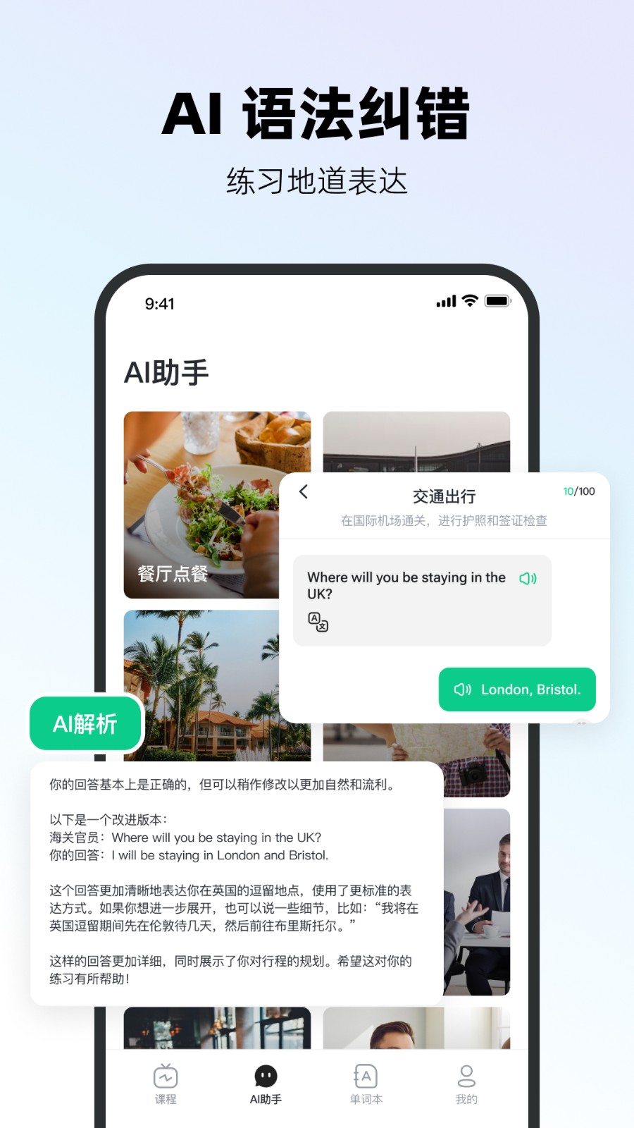 本应用集合了丰富的英语学习资源,包括日常对话、商务英语、语法讲解、词汇积累、听力训练、阅读理解和写作指导等,满足用户不同阶段的英语学习需求。采用趣味化学习方式,结合AI智能技术,提供个性化学习路径,让学习更加高效、有趣。