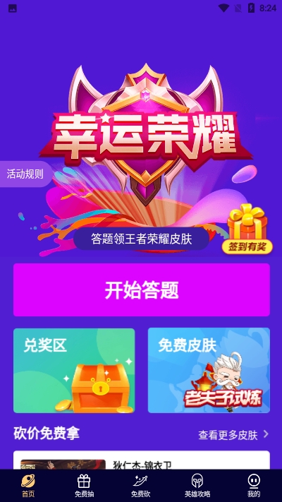 1、幸运荣耀app是一款王者荣耀答题小工具,在这里参加答题获得就可以获得皮肤了,还有限定皮肤;