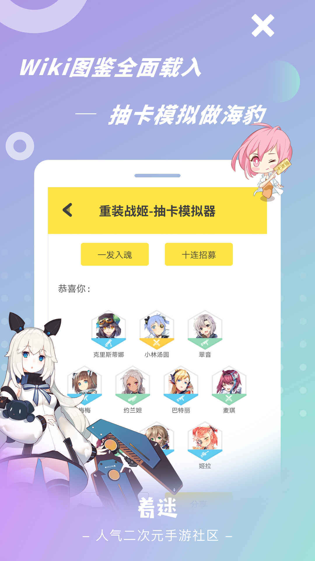 百万二次元玩家分享共同乐趣,参与活动晒运气爆(can)棚(dan),选可爱老婆,发美图日常,看圈子趣事,学大神攻略,靠玄学捞SSR,更有抽卡模拟、阵容模拟等实用工具,等你来玩