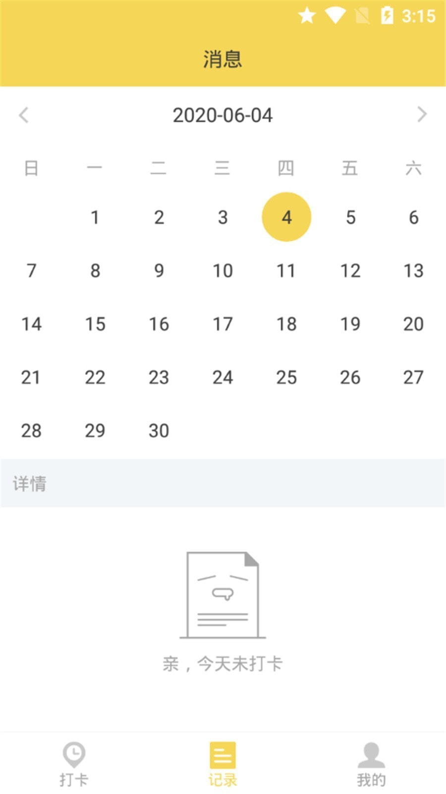 4、提供今日未打卡提示,如果用户在某天内没有打卡,在当天的记录中会提示未打卡信息;