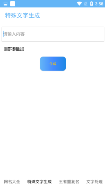 特殊符号生成器在线可复制app软件是一个可以运用到生活各个场景的一个特殊文字、网名、游戏名、社交名称生成软件。能即兴的输入你想生成的文字内容,快速的生成。还能给你处理文字,提供字体素材和特殊的符号生成的综合软件就在特殊符号生成器app!同样的,这里所有的文案信息都是根据大家的爱好来线上生成的,手机上面也可以学接触到很多的特殊符号。快来下载体验吧。