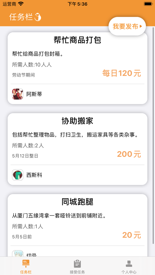 2、什么游泳陪练、帮忙搬家、同城跑腿之类的任务,在这里经常可以找到,任务接单一键完成。