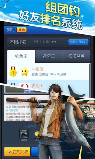 海钓大亨是一款3D写实风格的休闲钓鱼游戏,炫酷钓,独家特技,传说装备。可以组团钓,游戏自带好友排名系统。随心钓,韩国国民钓鱼游戏。全球钓,20多个不同的渔场钓点。任你钓,300多珍稀鱼类。游戏操作简单,通过点击屏幕和滑动屏幕即可完成钓鱼操作。无法亲自去海边钓鱼?这款游戏就能满足你哟,游戏内有各种钓鱼道具(鱼竿,线轴,鱼线,鱼饵,游艇等),玩家通过更新自己的装备可以进入更多的渔场,钓到更多高级的鱼种。